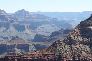 The main viewing spot at the Visitor Center, and the one probably most recognizable from photographs, are from this location called Mather Point located behind the Visitor Center. Another short hike along the Rim Trail heading West from the Visitor Center leads you to Yaki Point. This Rim Trail starts at the Visitor Center and heading West, will eventually take you all the way down to the Grand Canyon Village past several other points or overlooks. However, everywhere along the trail you can stop and take pictures because the Rim Trail literally follows the South Rim of the Canyon and there is no railing or anything else to stop you from walking off the paved trail and closer to the edge of the cliffs to get pictures. You'll see many people actually walking out onto rock formations to try and get as close as possible for that perfect picture. Not for me but I get as close as I'm comfortable with getting.